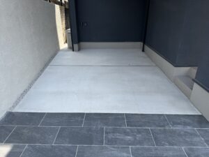 玄関前から駐車場にかけて家の外壁塗装と同じ落ち着いた色のタイルで統一しました。