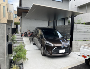 なので、玄関まで階段も併設して駐車場カーポートを施工致しました。