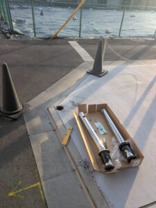 写真は補修工事時。左が車に折り曲げられたチェーンポール、右が新しい製品です。