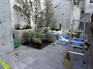 私はこちらの植木何本かをこちらのお庭に運んで作業しましたが、外構屋さんは花壇に使っている