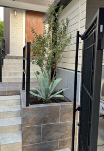 階段脇の花壇に手前からアガベ、フェイジョアと植えました。この高級感あるタイルにピッタリ