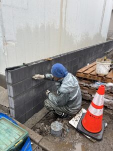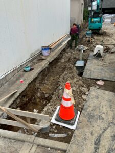 ここから掘削・床付け・砕石転圧・ブロック積工・コンクリート平板工・照明取り付け工事