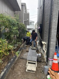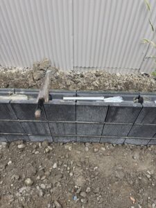 ひとつひとつのブロックの水平・通りを正確に合わせることで、後々のフェンス設置や外構全体の仕上がりに大きく影響することや