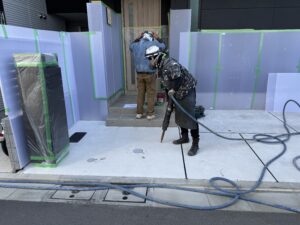 このようにコンクリートの破片が飛んでも周りを傷つけないようにしっかりと養生します。