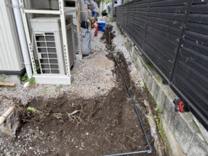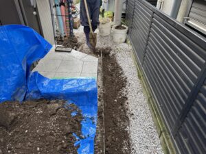 そして、お庭に立水栓を施工するため、玄関の方から水道管を伸ばしてくる為の作業をします。